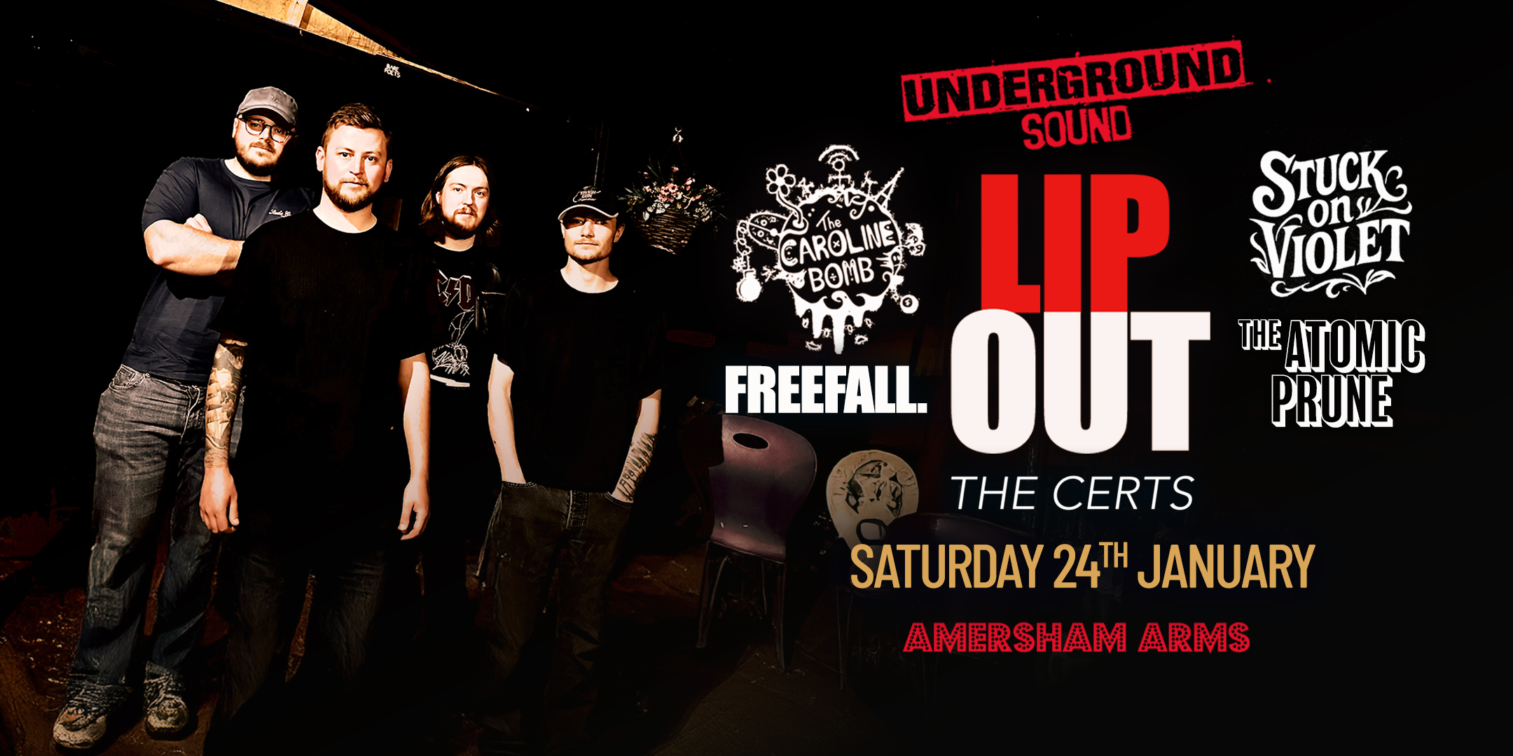 Line-up: Lip Out / The Caroline Bomb / Stuck on Violet / The Atomic Prune / FreeFall. UK / The CERTS